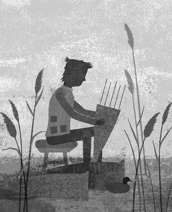 Я подъезжаю к «Зимородку». Папа сидит на табурете на зелёном берегу и плетёт из ивовых прутьев корзину для ловли угрей. Неуклюжка, наша утка, устроилась рядом. Над оранжево-бирюзовой яхтой из трубы поднимается ниточка дыма.