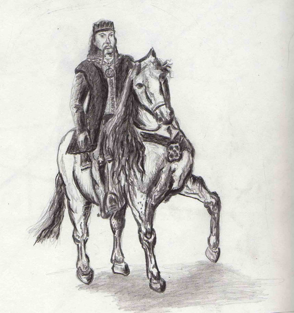 Когда человек на лошади подъехал, актёры смогли рассмотреть его получше. Это был уже немолодой, худощавый, высокий человек с гладко выбритым лицом. Его тёмные волосы были заплетены в небольшую косу, тонкие губы плотно сжаты. Шею правителя украшал изумительно тонкой работы серебряный торквес6, на груди висела золотая цепь, а длинные благородные пальцы были украшены драгоценными камнями. Он легко соскочил с лошади, и в свете уличных фонарей друзья увидели его суровый взгляд. Все молча поклонились подошедшему.