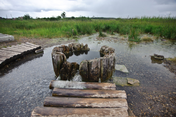 На следующем перекрёстке сворачиваем налево, на улицу Герцена, и идём по направлению к Усолке, где выйдем к Людмилинской рассолоподъёмной скважине (№8 на карте, 59°39’28˝ с.ш. 56°46’58˝ в.д.). Это память о солеварении, благодаря которому и возник город. Интересно, что при её бурении в 1906 году были обнаружены калийные соли. Это открытие, сделанное техником Н. П. Рязанцевым, стало одной из предпосылок бурения глубоких скважин в 1925 году, когда под руководством геолога П. И. Преображенского вскрыли калийную залежь. Первая вскрывшая ее скважина находится недалеко отсюда – в заречной части города, на её месте установлен памятный знак (59°39’26˝ с.ш. 56°46’42˝ в.д.). Рядом с Люмилинской трубой можно увидеть и бетонную конструкцию с грубо сделанной буквой «с» (59°39’30˝ с.ш. 56°46’53˝ в.д.), которая стоит на месте одной из первых солеразведочных скважин (№3), можно увидеть проржавевшие обсадные трубы.