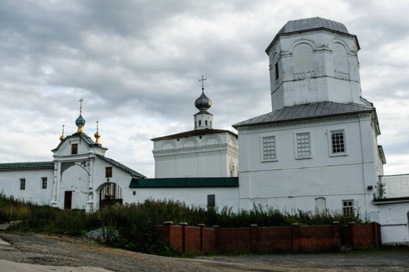Продолжая движение по улице Набережной, мы подходим к ансамблю мужского монастыря (№5 на карте), когда-то прикрывавшего южный фланг города. За время своего существования он несколько раз менял названия: появился как Вознесенский, затем сюда перенесли Спасо-Преображенский Пыскорский, долгое время он был Троицкий. А в советское время постройки бывшего монастыря передали Усольлагу. Через этот лагерь прошёл известный писатель Варлам Шаламов. Ныне здесь вновь возрождается православный монастырь. Монастырь состоит из надвратной церкви Михаила Малеина с колокольней, построенной в 1731—34 годах и Вознесенской, позднее Троицкой церкви, постройки 1698—1704 годов. Интересно, что при археологических исследованиях на территории Вознесенского монастыря в Соликамске был найден жертвенник в виде кострища, около которого обнаружена выкладка из трех конских челюстей. В центре кострища был аморфный кусок кричного железа. Это свидетельствует о культе коня в древности.