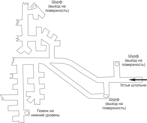 План одного из рудников в долине реки Егошиха (в районе издательства «Звезда», по материалам Ю. Б. Смирнова)
