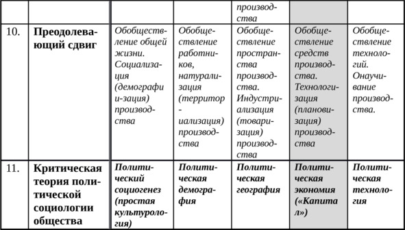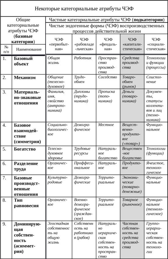 В качестве наглядной иллюстрации приведём небольшой модернизированный фрагмент этой таблицы (рис. 7—1 и 7—2). В приведённом фрагменте таблицы, во втором левом столбце боковика, жирным шрифтом отмечены общие для всех ЧЭФ категории, а курсивом, в остальных пяти столбцах, – частные категории (подкатегории), присущие лишь отдельным ЧЭФ. Подкатегории ЧЭФ «капиталистическая» выделены в таблице заливкой светло-серого тона.