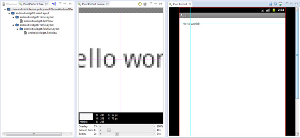 Представление Windows отображает список подключенных Android-устройств без детализации. При выборе устройства и нажатии кнопки Inspect a screenshot in the pixel perfect view панели инструментов окна Windows снимок экрана выбранного Android-устройства открывается в представлениях Pixel Perfect Loup и Pixel Perfect. В представлении Pixel Perfect Tree отображается дерево View-объектов GUI-интерфейса приложения, формирующего снимок экрана. При выборе View-объекта в окне Pixel Perfect Tree, его расположение обозначается красной рамкой в окне Pixel Perfect.