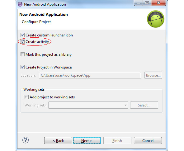 Введем имя приложения, отображаемое в устройстве, имя проекта, имя пакета. Выберем минимальную версию SDK, предпочтительную версию SDK, версию SDK относительно которой приложение будет компилироваться, тему приложения и нажмем кнопку Next. Оставим отмеченными флажки Create custom launcher icon и Create activity и нажмем кнопку Next. Определим значок приложения и нажмем кнопку Next. Выберем создаваемый Activity-компонент и нажмем кнопку Next: