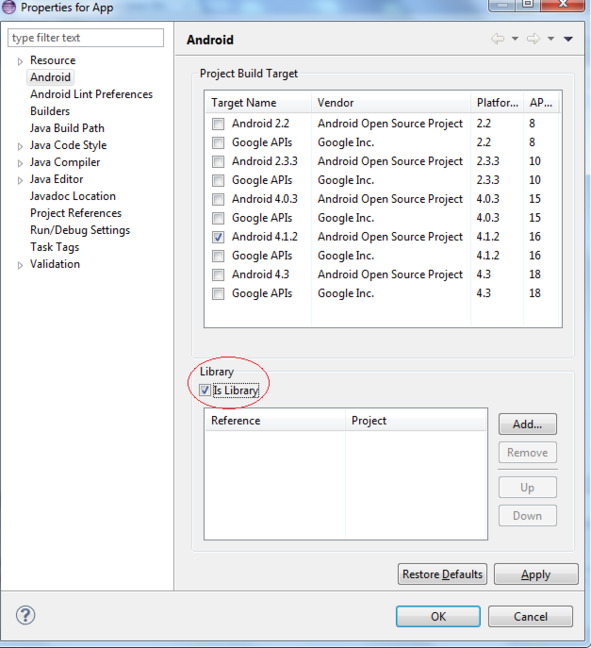 Для создания Android-библиотеки нужно в окне Package Explorer нажать правой кнопкой мышки на узле Android-проекта и в контекстном меню выбрать команду Properties. Далее в разделе Android отметить флажок Is Library и нажать кнопку OK.