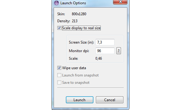 Флажок Wipe user data позволяет при запуске виртуального устройства стереть его сохраненное состояние, при этом будет отключена опция Launch from snapshot.