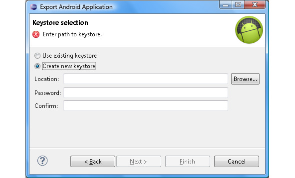 Для создания хранилища закрытого ключа в окне Export Android Application выберем переключатель Create new keystore, в поле Location: введем путь файла хранилища, в полях Password: и Confirm: введем пароль хранилища и нажмем кнопку Next.