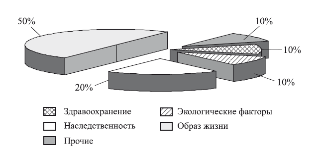 Эксперты ВОЗ в 1980-х гг. определили ориентировочное соотношение различных факторов, влияющих на здоровье современного человека (формула здоровья), выделив в качестве основных четыре производные. Это соотношение применительно к нашей стране распределяется следующим образом: генетические факторы – 15–20 %; состояние окружающей среды – 20–25 %; медицинское обеспечение – 10–15 %; условия и образ жизни людей – 50–55 % (рис. 1.1).