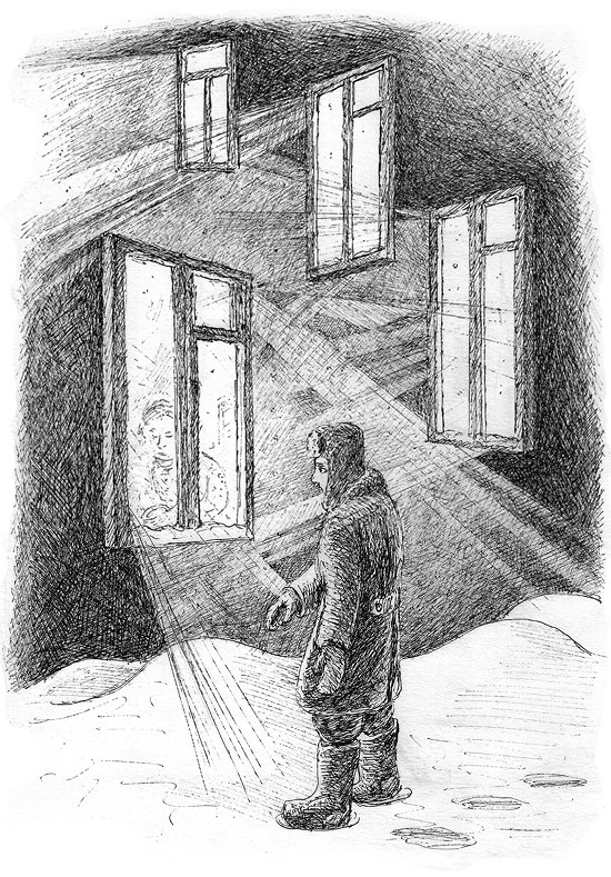 Окна висели вокруг него, освещая пространство. За окном кто-то был, Леонтий всмотрелся внутрь окна и увидел свою мать, она стояла над плитой, видимо, жарила шанежки, не замечая его. Леонтий постучал в стекло, тихо, чтобы не напугать, но мать не оборачивалась, продолжая хлопотать над плитой. Он заглянул за раму окна, но за окном никого не было, только стена падающего снега. С другой стороны окно было мертвым, пустым, стекла покрылись пушистым льдом, почти не проходимым для света. Сам свет был голубым, не желтым, как с другой стороны. Леонтий приложил к стеклу ладонь, лед стал таять, позволяя увидеть заснеженную улицу, черные дома, заваленные по самые окна сугробами, лохматую собаку, бегущую по своим делам…