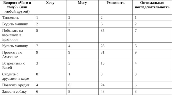 В столбце 4 напишите напротив каждого желания произведение значений 2 и 3. Теперь найдите в столбце 4 самую маленькую цифру и напротив нее в столбце 5 поставьте цифру 1. Далее – цифру 2 напротив следующего по величине значения 4 столбца и т. д. Одинаковым величинам в столбце 4 присваиваются соответственно одинаковые индексы в 5-м.