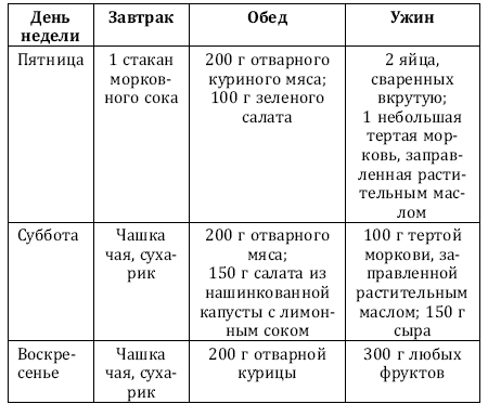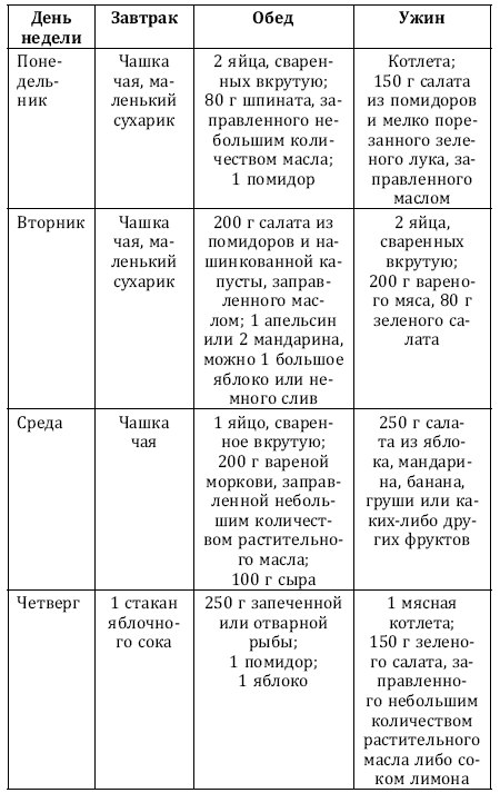 Каждый день нужно съедать 4–5 яблок, 1 апельсин, 80 г постного отварного мяса, 2 сухарика или небольшой кусочек хлеба.