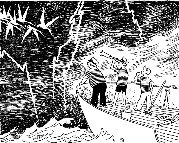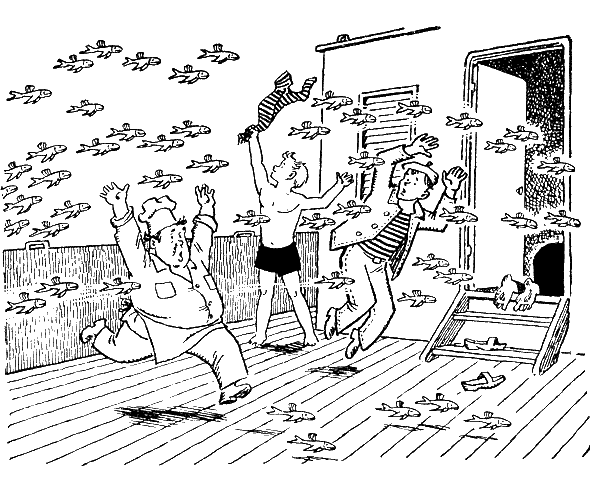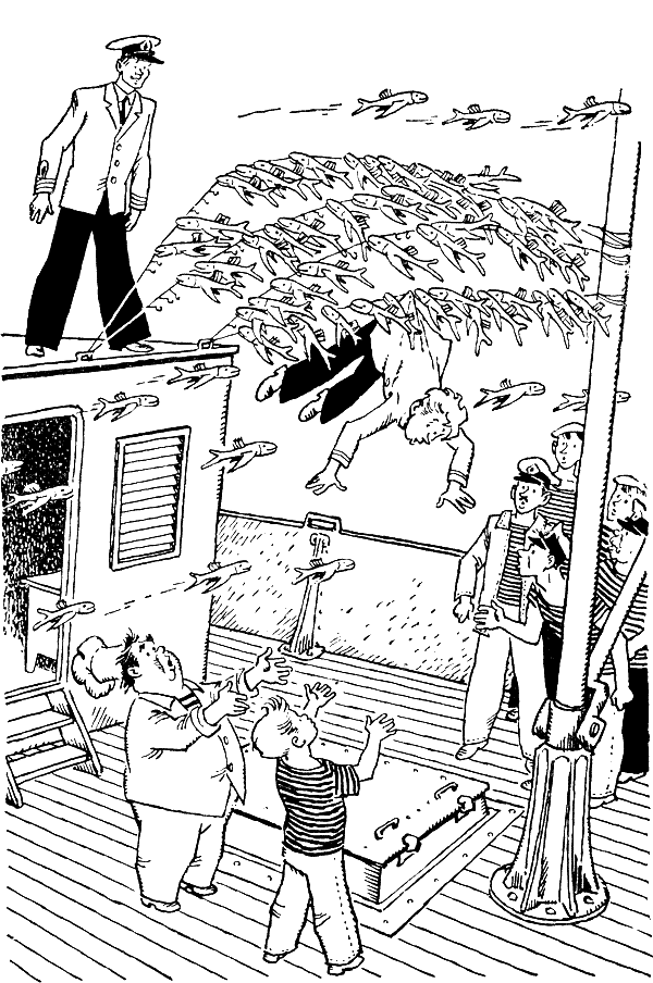 В этот момент разбуженный толчком Борщик открыл глаза и, слегка заикаясь, стал будить Солнышкина. Над кормой пари́ли тысячи рыб, а среди них, на крючках, висел Пионерчиков. Штурман размахивал руками, будто дирижировал этим летучим ансамблем.
