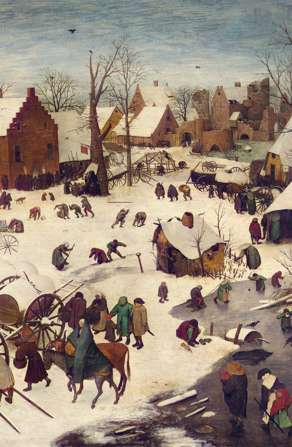 Bruegel’s Census at Bethlehem therefore depicts a world in transformation. The census is drawn through the village, through that mess of humanity at the inn door, like the carding of wool. The stream of individuals passes back and forth over the frozen river: people come in nebulous and free to have their names written down in a book, their existence validated in ink; they go out docketed and numbered, but also informed, no longer unlicked stray lumps of humanity but named individuals, with a location and an occupation and a marital status, enjoying a spark of existence beyond their own clay.