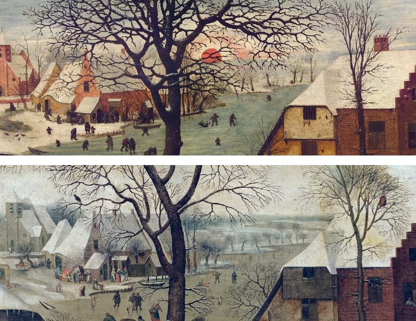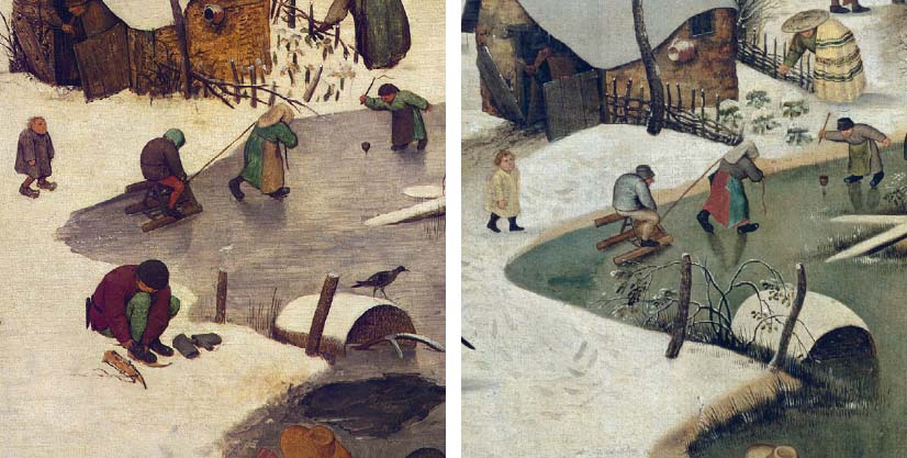 And there is in fact one final difference – a figure, present in the Elder’s panel but absent in all the Younger’s copies, suggesting a late emendation on the father’s part, a final gratuitous flourish of his art: it is the youth pulling on his skates, below the tiny child who cannot yet summon the courage to go out on the ice.