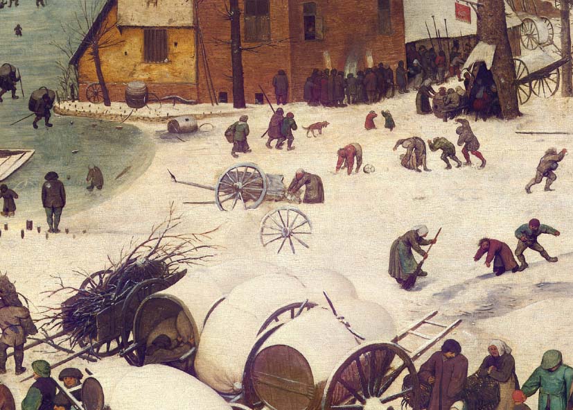 And then, more slowly, I see that the Younger favours tracks. From the bottom right, where Mary has entered on her donkey or ass, to the top left across the frozen river; and again, from the wheels of the foreground frozen carts, there are criss-cross tracks, paths, desire lines, animating the space. This is a frozen world, but there is evidence of networks, organized around an axis.
