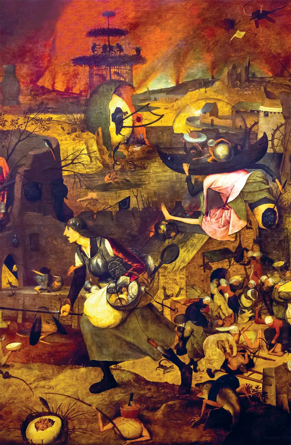 The Elder’s foreground carts, by contrast, are going nowhere. There are no paths, just yellowish ice wallows. He has painted a village of spindly cartwheels, a spindly ladder against a spindly barn, spindly trees. And he has painted a world of endlessly repeated circles – the wreath, the barrels, and especially the cartwheels, thirty-one of them, including one a fraction below dead centre, hitched to no wagon and orthogonal to the viewer, as though it were not a material object at all, but a diagram of the interlocking cycles of village life and the seasons, of the great wheels of history and Christian redemption.