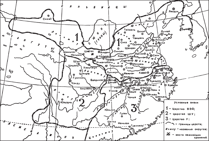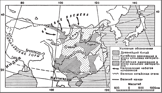 Период «Борющихся царств», когда китайское государство пребывало в состоянии раздробленности, сменился властью империи Цинь, продержавшейся, впрочем, недолго – с 221 по 207 год до н.э. После короткой гражданской войны в Китае утвердилась династия Хань, просуществовавшая до начала III в. н.э. Ханьская империя являлась одним из крупнейших государств, существовавших на рубеже древнего мира и средневековья. По территории, количеству населения и уровню цивилизации рядом с ней в то время можно было поставить только Римскую империю и центральноазиасткую империю Кушанов.