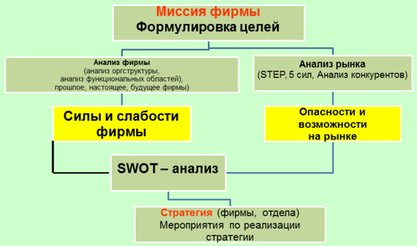 В ней представлен SWOT-анализ, где в разделе Возможности вместо рыночных возможностей перечислены стратегические решения, например —