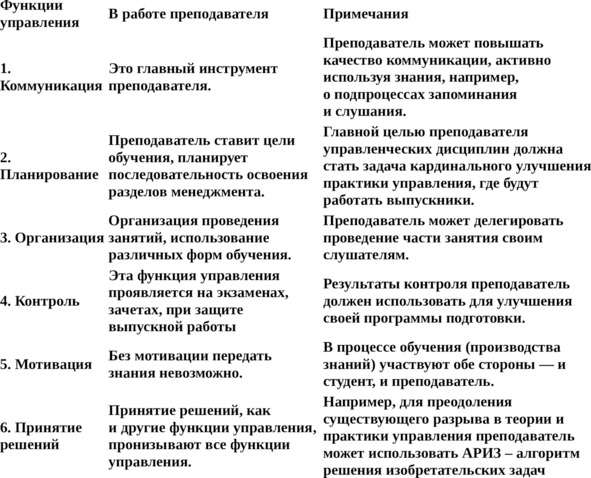Ниже представлена таблица, где я перечисляю функции управления и иллюстрирую как эти функции проявляются в работе любого преподавателя менеджмента (и не только):