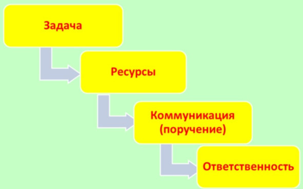 Руководитель делегирует своему подчиненному задачу и ресурсы для ее выполнения. Подчиненный берет (или не берет) на себя ответственность за решение задачи и использование ресурсов для решения этой задачи.