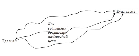 Еще сложней дело обстоит с анализом «куда мы собираемся двигаться». Например, определив первоначально свои цели (конечные желаемые результаты или состояния) компания переходит к третьему этапу планирования – начинает выбирать оптимальные пути достижения этих целей. В ходе анализа этих путей выясняется, что на рынке есть (или недавно появились) новые возможности и/или опасности, которые первоначально в учет не брались. И тогда получается, что в ходе определения пути развития (фактически – стратегии достижения цели) – целесообразно намеченные в такие-то сроки первоначальные цели изменить.