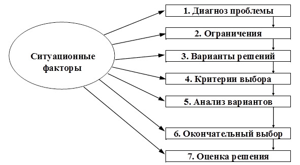При этом, как видно из рисунка, на всех этапах принятия решений учитываются ситуационный факторы.