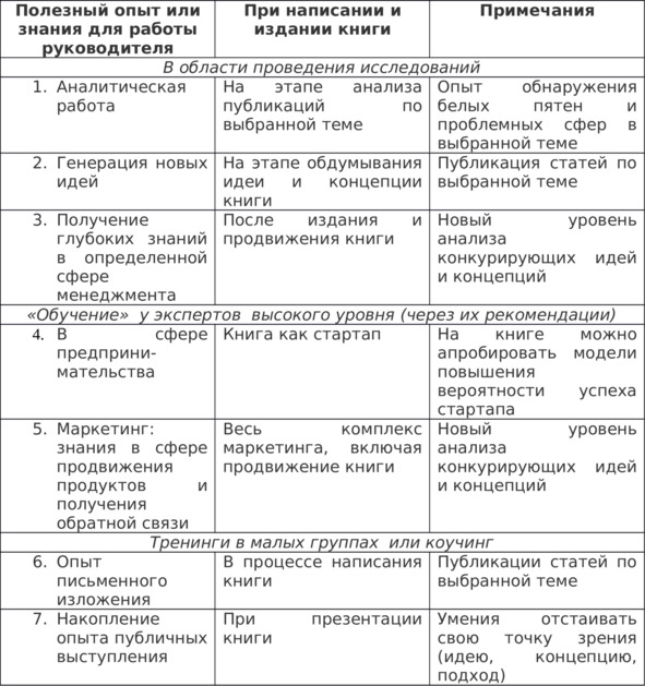 Ниже представлена таблица, где я представляю знания и опыт, которые руководитель может получить, если для получения управленческих знаний выберет альтернативный получению степени DBA вариант – написание и издание своей книги.