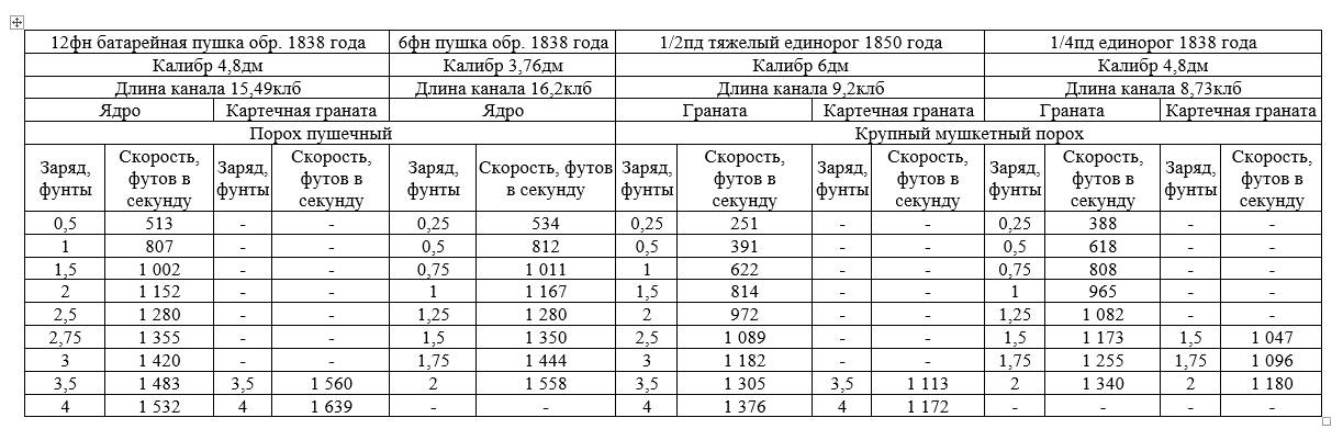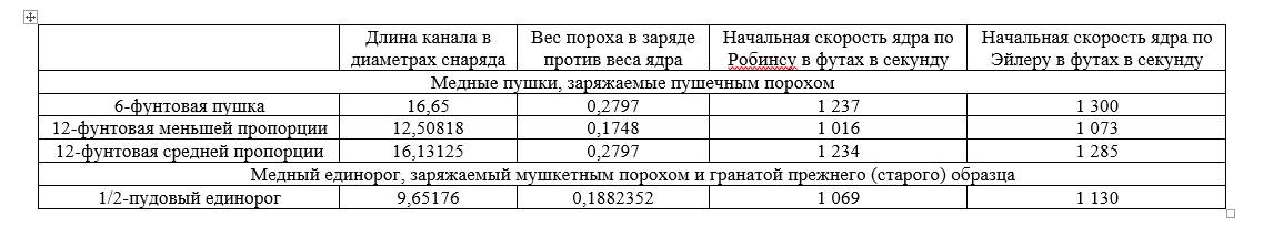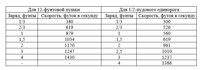 Полученные в этой таблице значения начальных скоростей не противоречат сведениям из книги «Основания для понтонной и артиллерийской науки» 1816 года издания, где говорится, что опытным путем было установлена скорость разгона ядра до 1 250…1 500 футов в секунду для пушек системы обр. 1805 г. при заряде в 1/3 веса ядра.