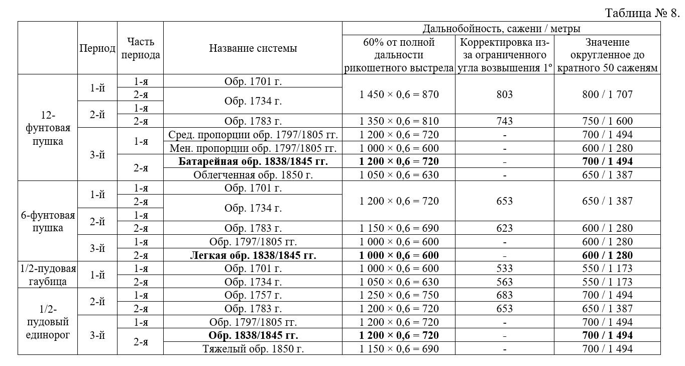 В начале 3-го периода ко всем орудиям полевой артиллерии вводится диоптр, обеспечивающий максимальную дальность стрельбы в 600…700 саженей (1 280…1 494 метров)71, однако дальний предел (дальнобойность) для прицельной стрельбы ядрами и гранатами был принят у легких орудий в 400 саженей (853 метра), у батарейных – 500 саженей (1 067 метров)72. Установление дальнего предела для прицельных выстрелов было обусловлено необходимостью отслеживания как минимум половины всех падений снарядов для корректировки ошибок в наведении с целью достижения требуемой действительности выстрелов73. Так, установленному пределу для легких орудий 3-го исторического периода в 400 саженей (853 метра) можно найти объяснение в статье поручика артиллерии Тауберга (опубликовано в «Артиллерийском журнале» № 5 за 1847 год), где сказано, что огонь должен открываться с такой дистанции, когда можно ожидать хорошего действия, предусматривающего попадания в цель не менее 25 % от всех выпущенных снарядов. И хотя на практических учениях при стрельбе прицельными выстрелами из 6-фунтовой пушки в щит шириной 40 шагов (28,4 метров) и 6 футов (1,82 метра) высотой (имитировал фронт пехотной роты) с расстояния 1 300 шагов (925 метров) попадало 25 % всех выстрелянных ядер, но легкие батареи не должны были занимать 1-й позиции далее 1 200 шагов (853 метров) от противника, поскольку в боевых условиях результаты стрельб мирного времени не достижимы. Сведения о дальности прицельных выстрелов орудий ядрами и гранатами указаны в таблице № 9.