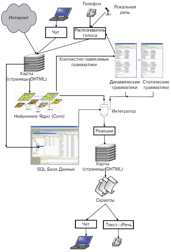 – интерфейсы к различным каналам ввода/вывода, по которым могут поступать речевые и текстовые сообщения;– нейронное ядро (Core), в котором можно создавать искусственные нейроны вместе со связями (нервами), способными передавать возбуждения;– база данных вместе с ODBC интерфейсом;– карты – объекты представления данных в виде динамических страниц;– скрипты – аналоги внешних реакций;– языковые оболочки Java и JavaScript;– XML-грамматики (динамические и статические);– интегратор – подсистема, способная исполнять динамические коды.– создание рабочих таблиц;– добавление и модификация данных;– добавление и модификация формул;– добавление и модификация макрокоманд Visual Basic;– интеграция с другими системами через ODBC, XML, OLE и т. п.;– интеграция с другими системами через DLL, C++ и т. п.– создание и обучение нейронных слоев;– программирование реакций на возбуждения, поступающие извне;– добавление нейронов и модификация их связей;– добавление и модификация макрокоманд Visual Basic или JavaScript;– интеграция с другими системами через ODBC и XML;– интеграция с другими системами через Java, DLL, C++ и т. п.
