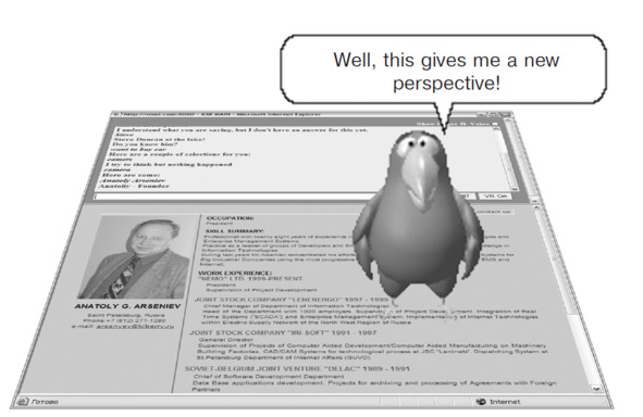 Практически все компоненты этой среды свободно доступны в Интернет и могут быть использованы при построении приложений на базе разных платформ – , или . Некоторые из них, такие, например, как или для распознавания и синтеза речи, зависят от операционной системы, и их применение возможно только под управлением . Технология Агентов, разработанная в Микрософт, позволяет использовать еще одну координату в структуре страниц. Агенты, существующие как бы вне плоскости документа (рис. 11), могут представлять автора и выполнять роль виртуального помощника для посетителей Веб-сайта. Microsoft Windows Unix Mac OS Microsoft Agent Microsoft Speech Application SDK Microsoft Windows