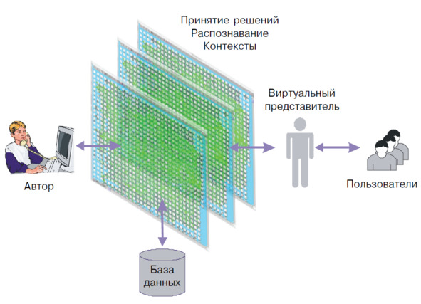 В отличие от индивидуальных систем связи, в основе которых лежат коммутации типа «точка-точка», персональные усилители способны одновременно соединяться со многими источниками данных, выделять из них определенную информацию и предоставлять ее пользователю в наиболее удобной форме. Такое решение является симметричным по отношению к виртуальным представителям в диспетчерских центрах (рис. 2) и может быть построено с применением все тех же базовых программных компонент. В этом случае виртуальный агент может выполнять роль индивидуального секретаря, динамически обучаясь и настраиваясь под знания конкретного пользователя и контекст его персонального компьютера.