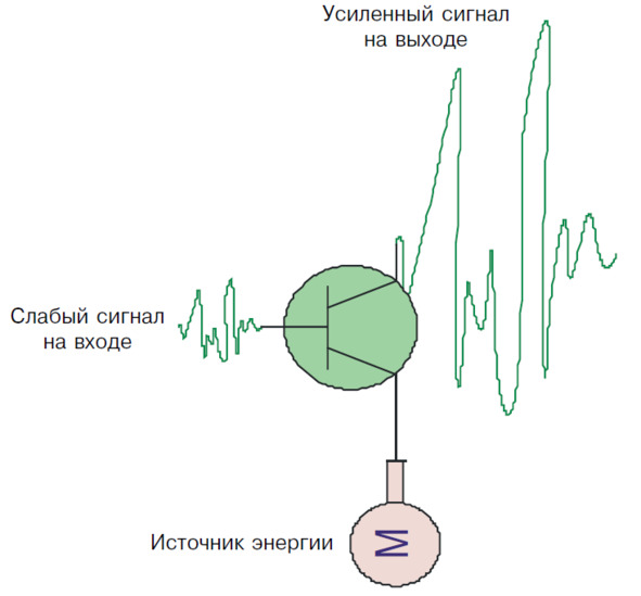 Для того чтобы лучше понять принцип работы информационного усилителя, рассмотрим, как происходит усиление в простейшем транзисторе. Если опустить технические детали, связанные с его внутренним устройством, транзистор является преобразователем, подсоединенным к источнику энергии, на управляющий вход которого поступает слабый сигнал, а на выходе получается сигнал, усиленный по мощности (рис. 3).