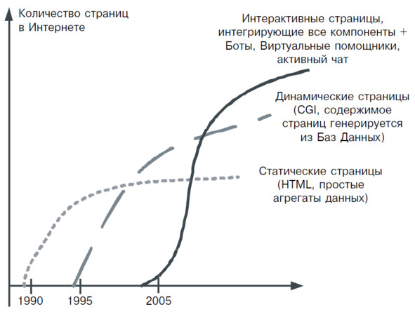 За сравнительно короткий период, прошедший с момента появления первых статических страниц в формате , Веб стремительно эволюционировал в направлении повышения функциональности страниц и расширения способов их передачи. Дж. Мартин подметил, что когда в нашем мире появляются принципиально новые технологические достижения, некоторое время они продолжают использовать старое содержание [17]. Например, в телевидении достаточно долгое время, начиная с момента его появления, большую часть новостей заполняли читающие текст дикторы, а телевизионное изображение было лишь фоном для аудиосообщений. Так же и в первом поколении Интернет, используются страницы, которые фактически дублируют печатную продукцию. Однако уже сегодня произошла практическая интеграция всех основных способов передачи данных, и у разработчиков появилась возможность применять как комбинации различных устройств (компьютеры, телефоны, радио и телевидение), так и новые функционально-активные объекты, вместо пассивных страниц текста, для организации общения с человеком. HTML