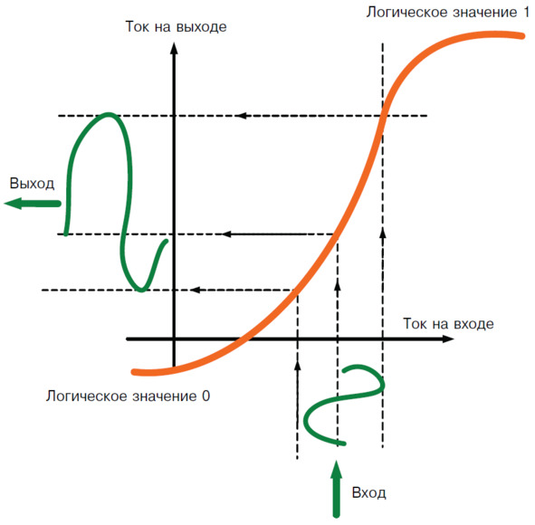 Появившиеся в 1948 году транзисторы, обладающие двумя устойчивыми состояниями (рис. 6), оказались вполне удачным решением для представления двоичных данных, и аналогии между транзистором и нейроном, как двоичными устройствами, надолго закрепились в теории и практике вычислительной техники. В это же время в других направлениях электроники широко используется свойство транзисторов по преобразованию сигнала в зоне переходного процесса между устойчивыми состояниями. Такое преобразование в транзисторах всегда носит приблизительный характер и обладает искажениями, которые могут быть в определенной степени скомпенсированы при помощи различных дополнительных элементов. Дуализм транзистора, в котором дискретность сочетается с непрерывностью, является хорошим примером комбинации точных и приблизительных () свойств в одном устройстве. Нейрон вполне соответствует этой аналогии, соединяя в себе определенную устойчивость вместе с промежуточными приблизительными состояниями, которые он может сохранять в зависимости от характера возбуждения и своего функционального назначения. fuzzy