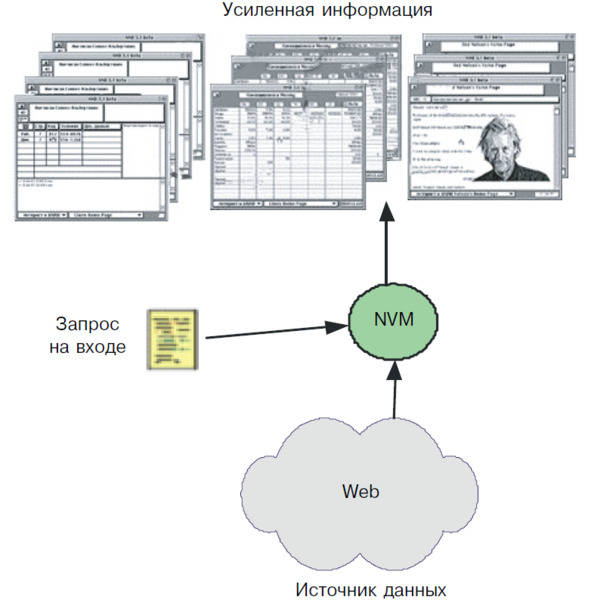 В статье «» [4], рассуждая о последующих поколениях систем, которые смогут повысить эффективность исследовательской работы человека, Буш очень образно пишет о принципиально новых формах энциклопедий, которые будучи соединенными с персональным устройством – , смогут комплексы ассоциативно-связанных знаний и тех следов, которые в этих знаниях может оставить исследователь. Перефразируя Буша, можно сказать, что информационное усиление – это извлечение гипертекстовых данных из динамических распределенных сетей и их преобразование в процессе интерактивного взаимодействия с человеком. Буш был по-видимому первым, кто достаточно конкретно определил основные компоненты интеллектуального усилителя: ассоциативно-связанные динамические данные, персональное устройство-преобразователь, пользовательский интерфейс. As We May Think memex усиливать