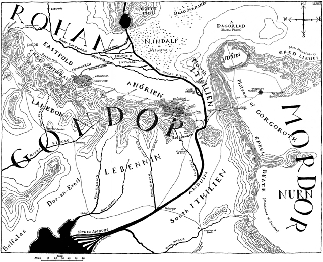 Gandalf passed now into the wide land beyond the Rammas Echor. So the men of Gondor called the out-wall that they had built with great labour, after Ithilien fell under the shadow of their Enemy. For ten leagues or more it ran from the mountains’ feet and so back again, enclosing in its fence the fields of the Pelennor: fair and fertile townlands on the long slopes and terraces falling to the deep levels of the Anduin. At its furthest point from the Great Gate of the City, north-eastward, the wall was four leagues distant, and there from a frowning bank it overlooked the long flats beside the river, and men had made it high and strong; for at that point, upon a walled causeway, the road came in from the fords and bridges of Osgiliath and passed through a guarded gate between embattled towers. At its nearest point the wall was little more than one league from the City, and that was south-eastward. There Anduin, going in a wide knee about the hills of Emyn Arnen in South Ithilien, bent sharply west, and the out-wall rose upon its very brink; and beneath it lay the quays and landings of the Harlond for craft that came upstream from the southern fiefs.