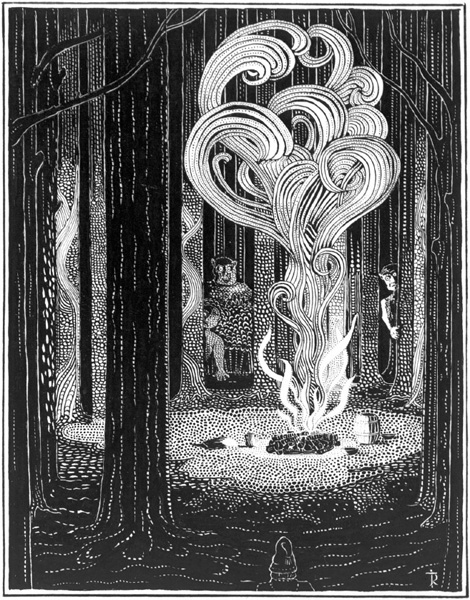 “You are a little out of your way,” said the elf: “that is, if you are making for the only path across the water and to the house beyond. We will set you right, but you had best get on foot, until you are over the bridge. Are you going to stay a bit and sing with us, or will you go straight on? Supper is preparing over there,” he said. “I can smell the wood-fires for the cooking.”