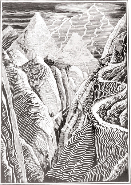 “The summer is getting on down below,” thought Bilbo, “and haymaking is going on and picnics. They will be harvesting and blackberrying, before we even begin to go down the other side at this rate.” And the others were thinking equally gloomy thoughts, although when they had said good-bye to Elrond in the high hope of a midsummer morning, they had spoken gaily of the passage of the mountains, and of riding swift across the lands beyond. They had thought of coming to the secret door in the Lonely Mountain, perhaps that very next last moon of Autumn—“and perhaps it will be Durin’s Day” they had said. Only Gandalf had shaken his head and said nothing. Dwarves had not passed that way for many years, but Gandalf had, and he knew how evil and danger had grown and thriven in the Wild, since the dragons had driven men from the lands, and the goblins had spread in secret after the battle of the Mines of Moria. Even the good plans of wise wizards like Gandalf and of good friends like Elrond go astray sometimes when you are off on dangerous adventures over the Edge of the Wild; and Gandalf was a wise enough wizard to know it.