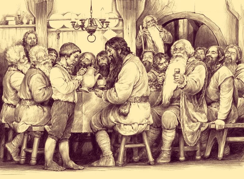 Гэндальф уселся во главе стола в окружении тринадцати гномов, а Бильбо примостился на табуретке у очага. Он грыз печенье (как ни странно, весь его аппетит куда-то исчез) и притворялся, довольно безуспешно, что происходящее ему не в диковинку, что он давно к такому привык. Гномы ели и ели, говорили и говорили, а время шло. Наконец они отвалились от стола. Бильбо встал, чтобы собрать тарелки.