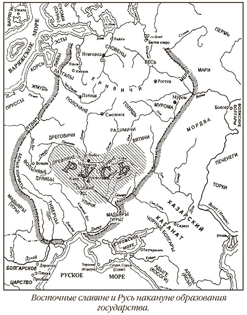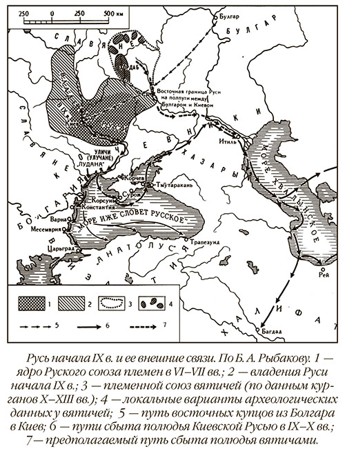 О том, что Русью первой половины Х в. было только Среднее Поднепровье, свидетельствует, в частности, летописный рассказ об убийстве древлянами князя Игоря в 945 г. «Рѣша же древляне: «Се князя убихомъ рускаго; поимемъ жену его Вольгу за князь свой Малъ»[79]. Из этой фразы явствует, что сами древляне тогда еще не были русью. И может быть, поэтому они не были участниками похода Игоря на Византию в 944 г. Хотя к этому времени Русь, как государство, территориально уже далеко вышла за пределы своей прародины. Видимо, в нее входило все пространство вдоль пути «из варяг в грекы», где проживали кривичи, словене, западные северяне и поляне.