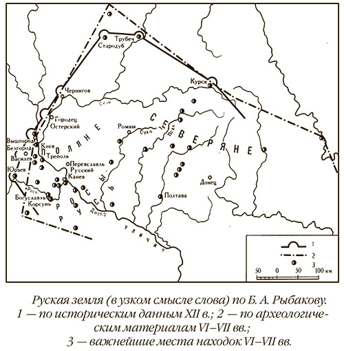 К значительно более раннему времени отнес формирование Руской земли Б. А. Рыбаков. Согласно ему, народ рос или рус угадывается в сирийском источнике VI в. («Церковной истории» Псевдо-Захарии) о неких богатырях hrоs, соседствовавших с амазонками и обладавших огромным ростом. Географически область народа pос должна соответствовать юго-восточной окраине антских племен, где распространена культура пальчатых фибул. Совпадение ареала последней с летописными данными о Руской земле позволило Б. А. Рыбакову отождествить данную культуру с древностями русов[72]. Что касается происхождения названия «Pос», то оно, возможно, восходит еще ко временам готского историка Иордана, упомянувшего «вероломное племя росомонов». В V–VI вв., после гуннского разгрома, название «Pос» или «Pусь» наложилось на имя Полян, а затем и вытеснило его[73].