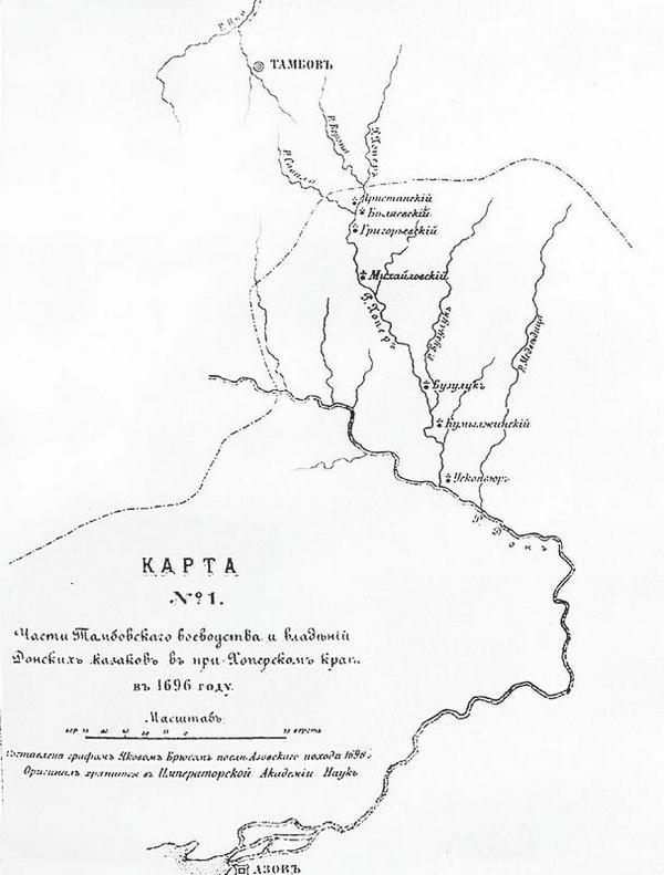 Начавшееся заселение берегов Хопра выходцами из Тамбовской и других областей Московского государства и Малороссии продолжалось и в последующие годы, так что ко времени Азовских походов, т. е. к 1695 году, на Хопре существовало уже несколько казачьих городков и станиц, хотя с незначительным на первых порах народонаселением. Но в общем побережье Хопра, в конце ХVІI столетия, было еще довольно безлюдно и пустынно 21).