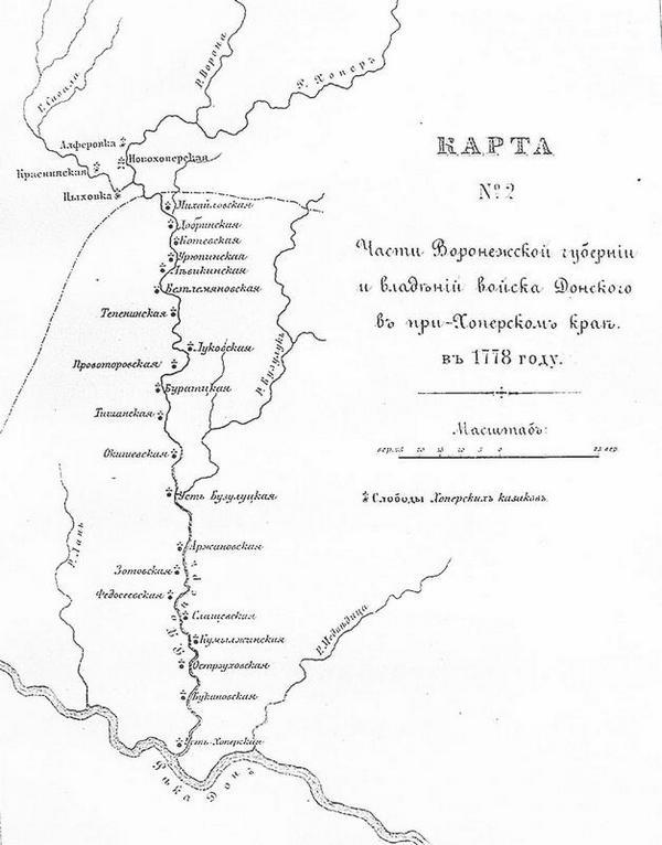 Вследствие такого неудобства, казаки стали хлопотать о пожаловании им земельных и лесных угодий, как было обещано при первоначальном заселении крепости Новохоперской и в конце концов добились своего[26]. По указу Государя и Царя и Великого Князя Петра Алексеевича из Воронежской губернской канцелярии, от 10-го мая 1720 года 75), юртовые земли со звериными и рыбными угодьями разоренных городков Пристанского, Беляевского и Григорьевского, которыми казаки прежде владели, были отданы хоперским казакам взамен денежного и хлебного жалованья. Границы земель в 1721 году были точно определены, обозначены и описаны, а самый чертеж и межевые записи укреплены подписями депутатов-старожилов окрестных слобод и селений. От Хоперской команды, как тогда называли казаков Новохоперской крепости, депутатами были старые казаки бывшей разоренной Пристанской станицы: Иван Жуков, Федот Лисицын, Иван Коновалов и Феодор Скворец: затем подписались депутаты от Хоперской крепости – посадские люди Михайло Масловский и Алексей Пономарев, а потом борисоглебские и тамбовские депутаты и служка Чернеева монастыря. Из этой межевой записи видно, что причисленные к Новохоперской крепости земли лежали по обе стороны р. Хопра, обнимая берега речки Савалы вплоть до речки Елани. Казакам собственно принадлежали пахотные земли, сенные покосы, лесныя угодья и девять рыбных озер в юрте бывшего Пристанскаго городка: Слуховое, Пересыпное, Перевесное, Калиновское, Чегонацкое, Трехтонное, Жирное, Зимовное и Рубежное. Взамен земельных и лесных угодий и рыбных озер. хоперские казаки должны были отбывать военно-конную службу на всем собственном содержании и обязывались иметь каждый по два коня, все прочее снаряжение и вооружение и даже порох и свинец покупать за свой счет 76).