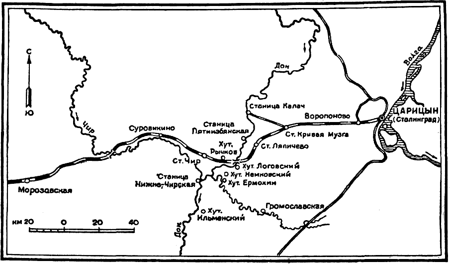 В вагоне Ворошилова собрался военный совет. Сведения поступали самые неутешительные. В двадцатых числах мая Ворошилов послал Артема с товарищами в Царицын, чтобы связать в одну задачу царицынский фронт и свое отступление. Много раз обстрелянный в пути, трехвагонный состав Артема пробился к Дону и благополучно переехал мост. На другой день белые напали на станцию Чир, отбросили отряды царицынских рабочих на левый берег и взорвали мост через Дон. Что делалось в Царицыне – теперь было неизвестно, вернее всего – делалось плохое. Морозовцы рассказывали о сосредоточии крупных мамонтовских сил в станице Нижнечирской и в станицах – выше взорванного моста – Калаче и Пятиизбянской. Начальник станции утверждал, что царицынцы отошли от Дона и отдали хутор Логовский (у самого моста) и левобережные хутора – Ермохин, Немковский и Ильменский – и даже будто бы отошли за станцию Кривая Музга, так что белые теперь под самым Царицыном.