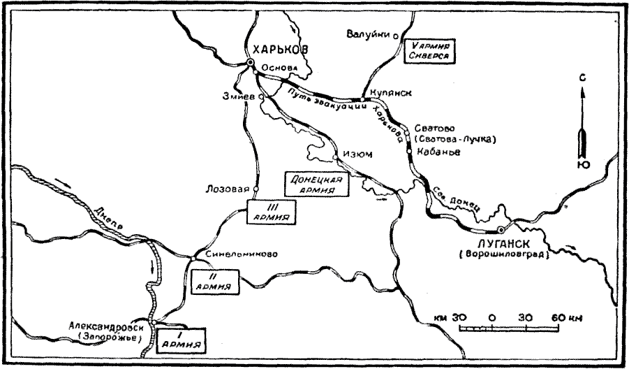 По магистрали Харьков – Луганск (между расположением 5-й и Донецкой армии) происходила эвакуация Харькова. Здесь, не теряя ни одного дня, нужно было создать сильную и стойкую группу.