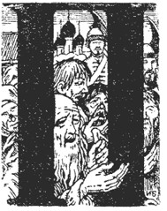 Вонзая в дубовый пол острие посоха, вошел патриарх Иоаким. Исступленные, в темных впадинах, глаза его устремились на низенькие окна под сводами. С той стороны к цветным стеклышкам прильнули головы стрельцов, взлезших на лестницы. Патриарх поднял сухую руку и погрозил. Головы отшатнулись.