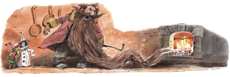 Когда куклы приволокли Буратино и бросили на пол у решётки очага, синьор Карабас-Барабас, страшно сопя носом, мешал кочергой угли.