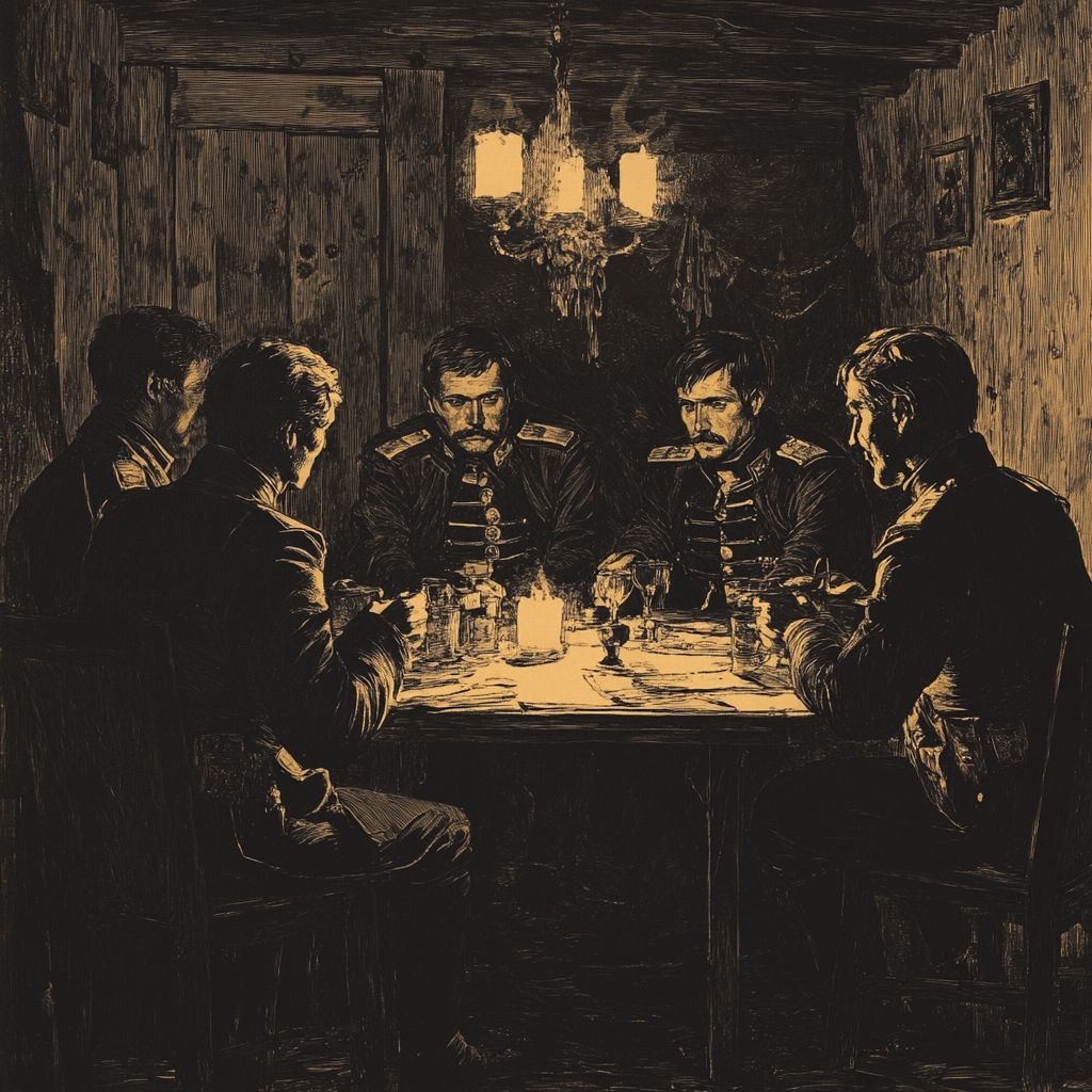 Когда самовар весь выпили, Ростов взял карты и предложил играть в короли с Марьей Генриховной. Кинули жребий, кому составлять партию Марьи Генриховны. Правилами игры, по предложению Ростова, было то, чтобы тот, кто будет королем, имел право поцеловать ручку Марьи Генриховны, а чтобы тот, кто останется прохвостом, шел бы ставить новый самовар для доктора, когда он проснется.