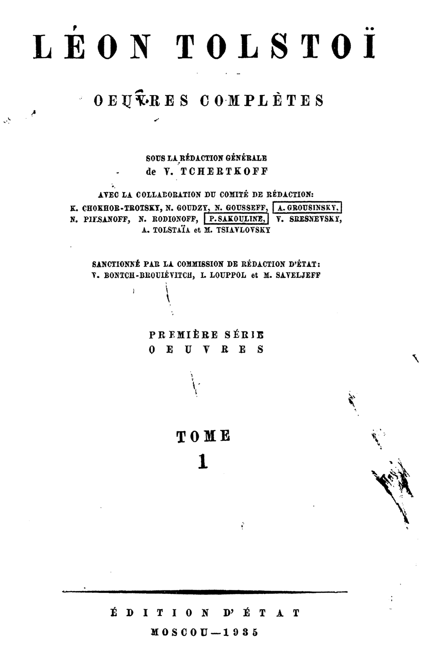 Приступая к изданию собрания сочинений Л. Н. Толстого, Советское правительство признало необходимым обеспечить совершенно полное и объективное издание этих сочинений, поручив непосредственную работу по редактированию тому другу покойного писателя, которого он сам выбрал для этой цели и который привлек к сотрудничеству с собой наиболее подходящие для этого дела научные силы. Государство считало себя, тем не менее, обязанным установить контроль, направленный именно к сохранению такой полноты и объективности.